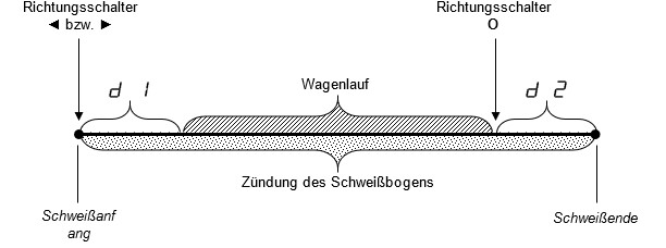 Verzögerungszeit für das Ausschalten des Lichtbogens Wenn der Richtungsschalter auf O steht: d 2 = 0 s – der Traktor stoppt und der Lichtbogen erlischt sofort, d 2 > 0 s – der Traktor stoppt und der Lichtbogen bleibt für die eingestellte Zeit aktiv. |