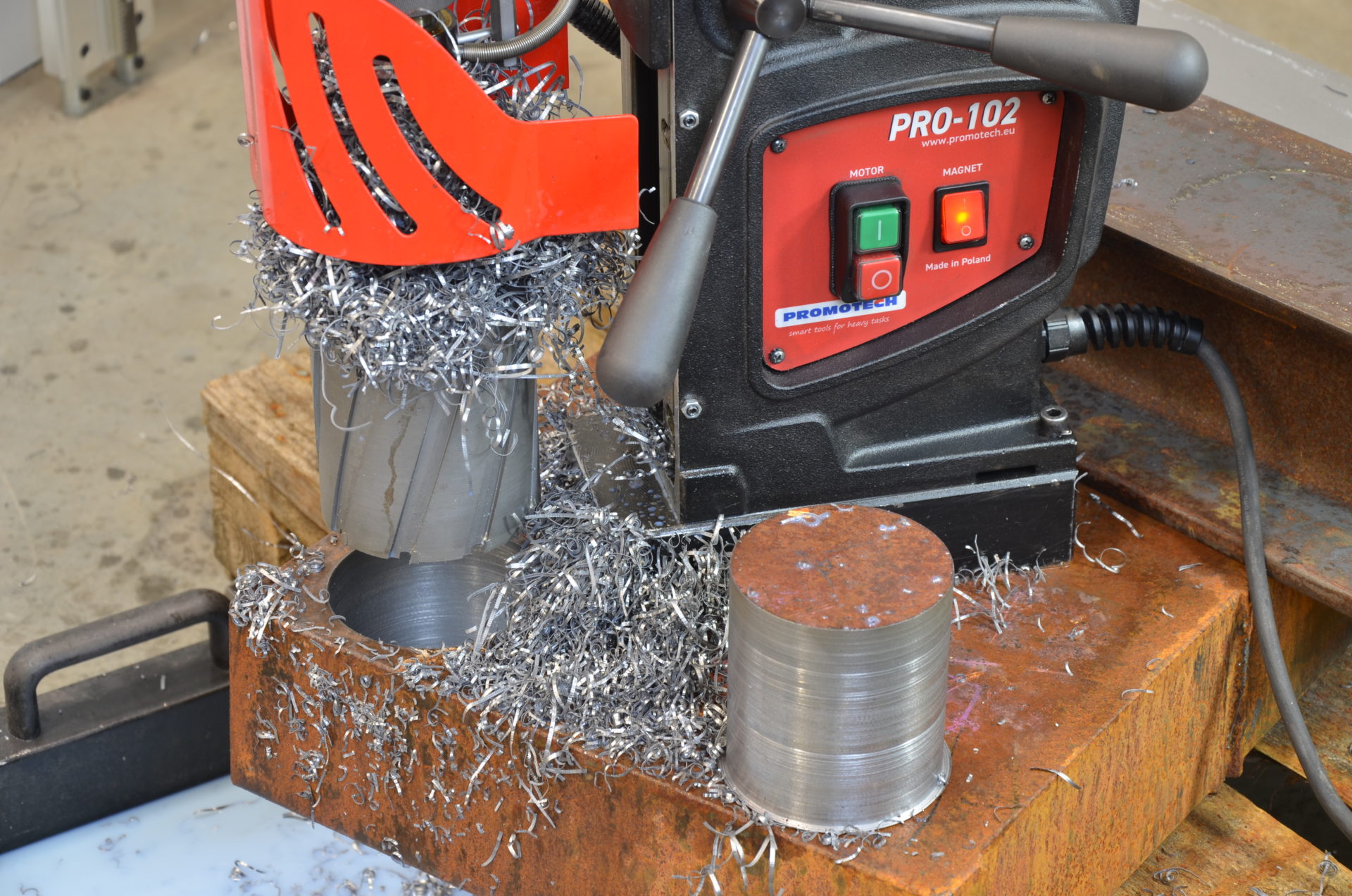PROMOTECH PRO-102 is a simple yet powerful magnetic drilling machine that enables precise milling up to 100mm in diameter and depth. A robust 1650W motor and a 4-speed gearbox (100, 175, 275, and 500 rpm) allow users to precisely adjust spindle speeds to suit various diameters and applications.