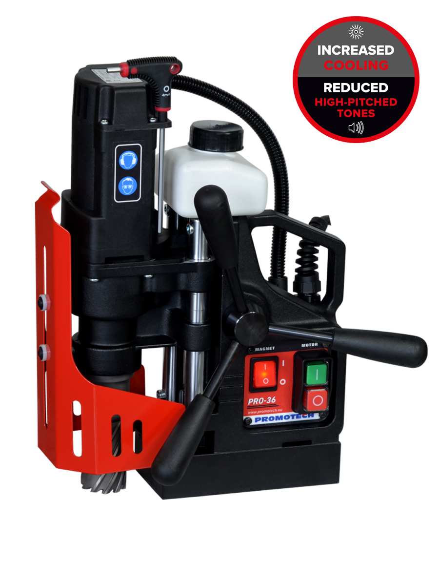 La PRO 36 está equipada con la base electromagnética de última generación con sistema de control de forma de campo magnético (MFSC) y módulo de control de adhesión de potencia magnético (MPAC), que detecta la fuerza adhesiva de la base electromagnética y protege tanto al operario como a la máquina cuando se taladran piezas muy finas.